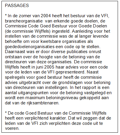 VFI is een branchevereniging voor goede doelen waar ruim 120 organisaties bij zijn aangesloten. Op hun website is een document te vinden met de titel Adviesregeling Beloning Directeuren van Goede Doelen. In het kader treft u enkele passages uit het document.